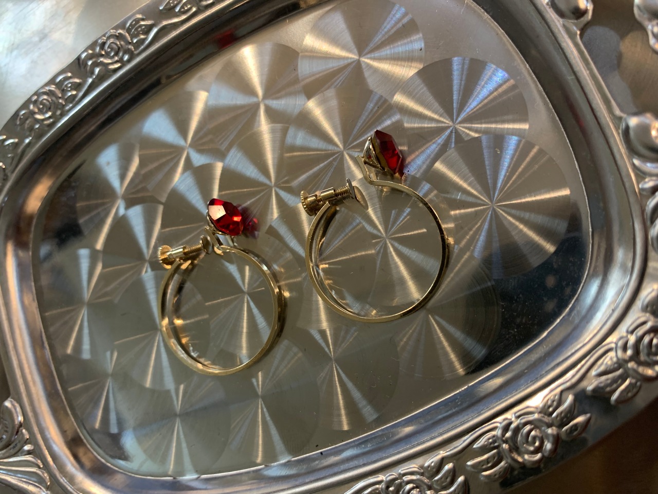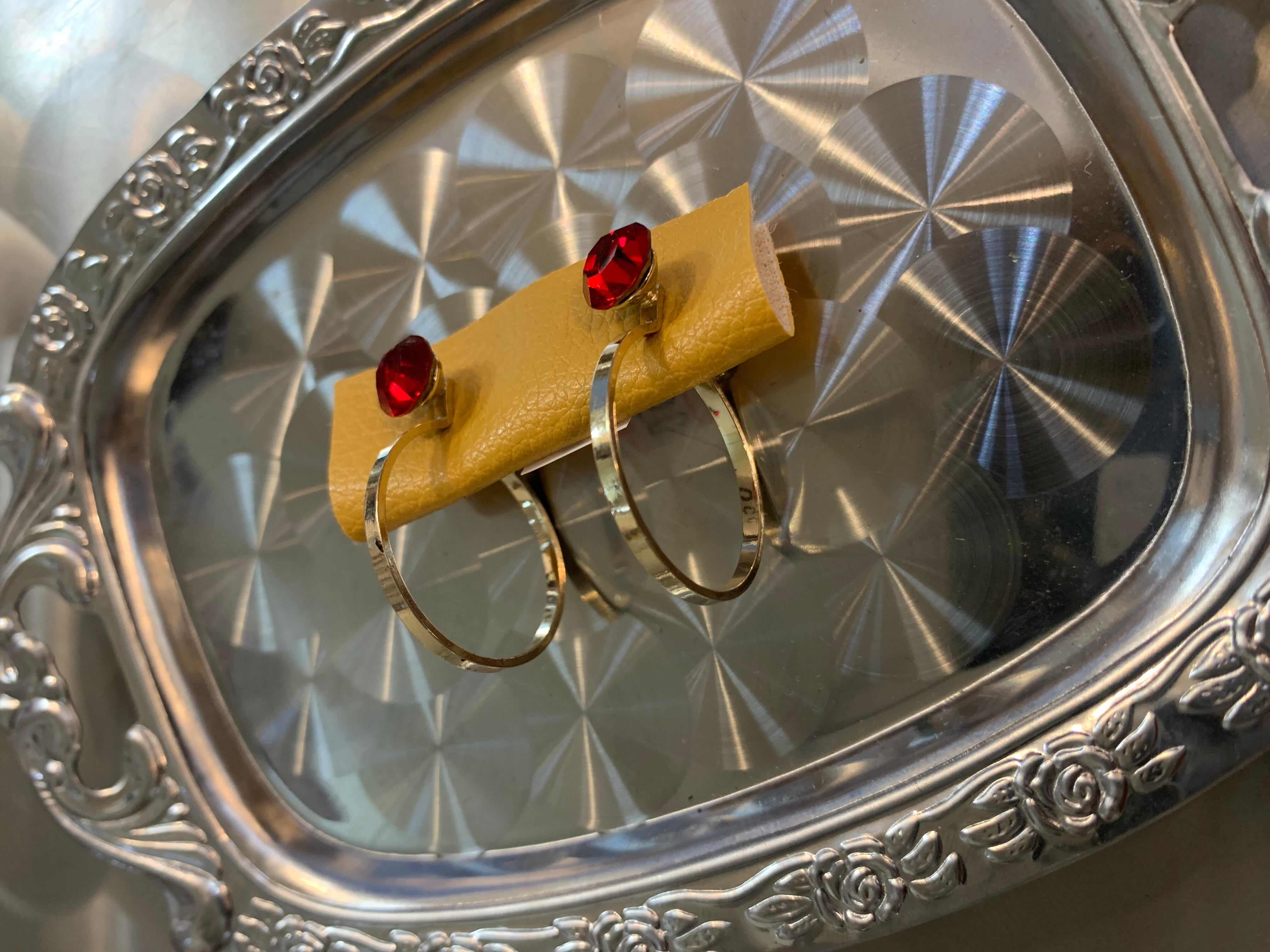 ルビー風の一粒石をあしらったフープ型のイヤリングです。