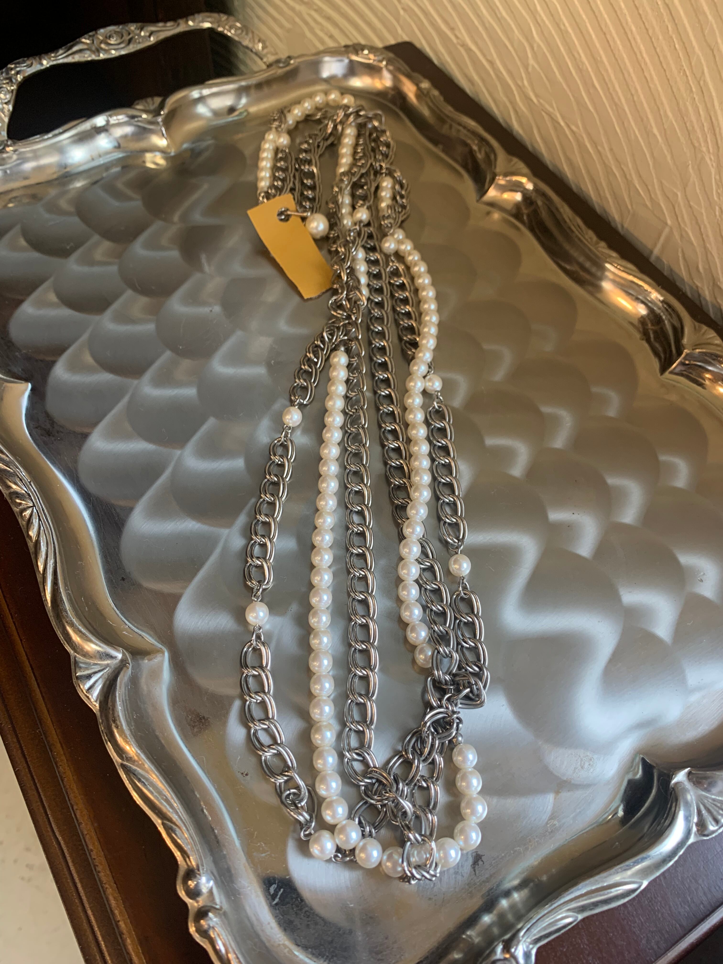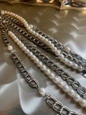 パールとチェーンを組み合わせたデザインのネックレス。長めのデザインで、ロックなイメージ。
