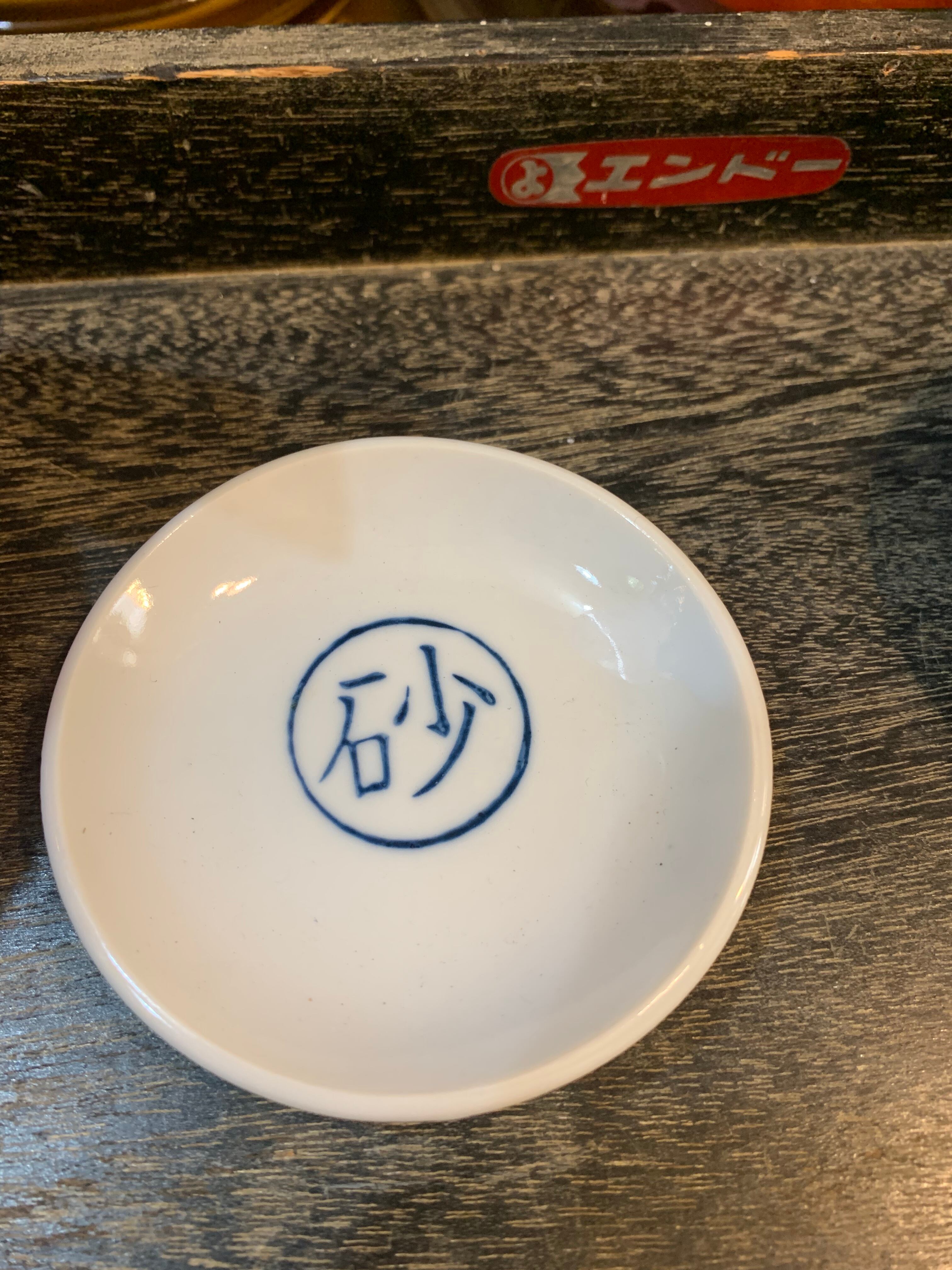 砂の文字が書かれた醤油皿。