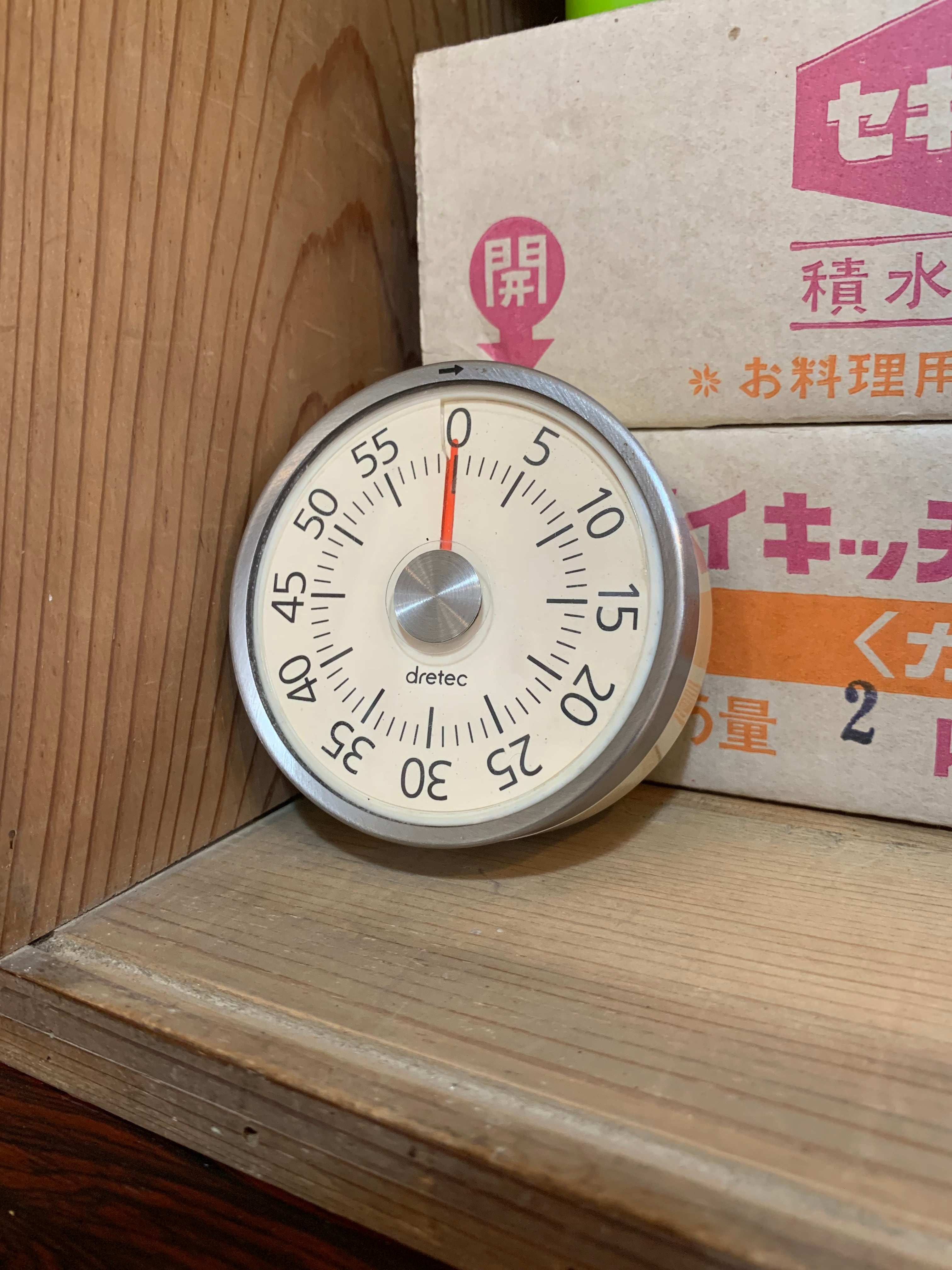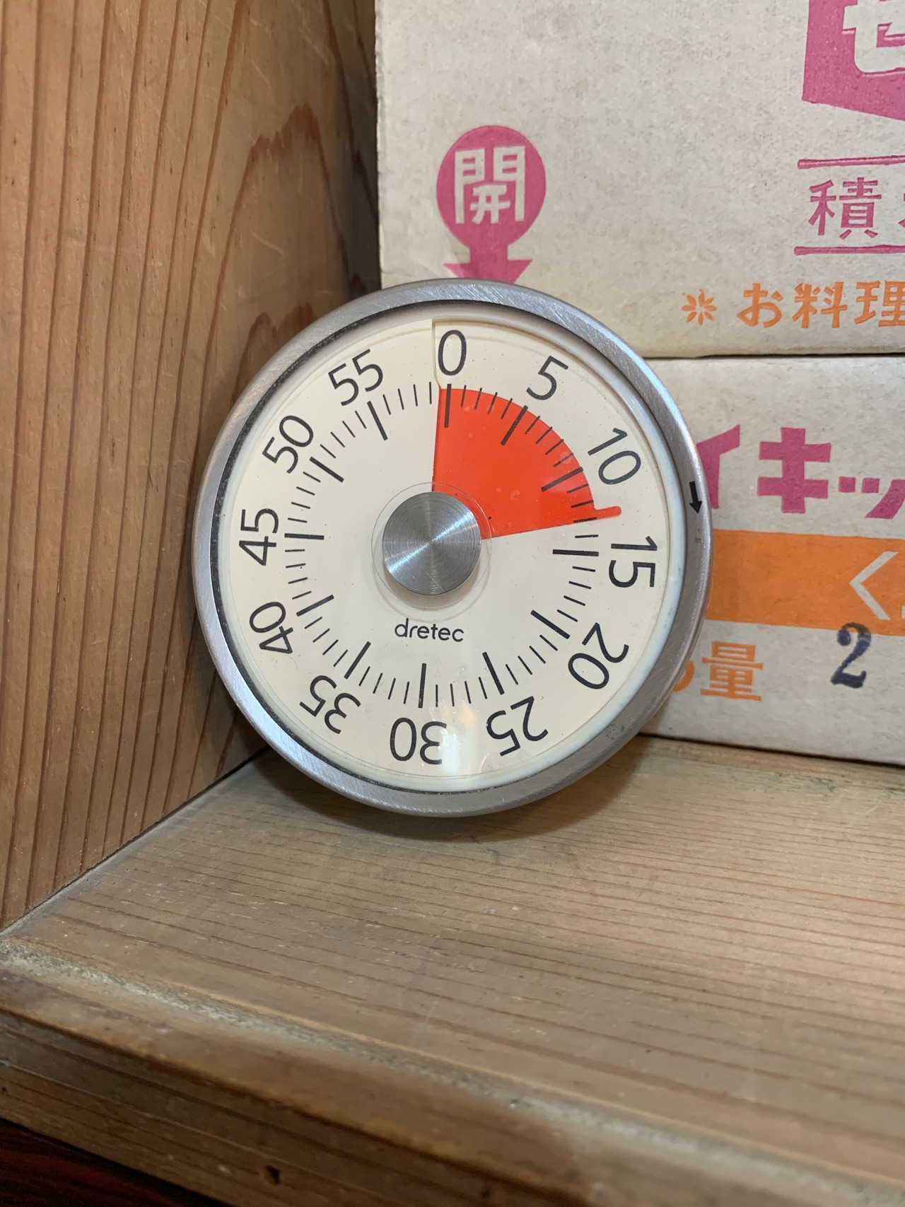 dretec製キッチンタイマー。オレンジのインジケーターが無機質なデザインに映え、かわいいです。