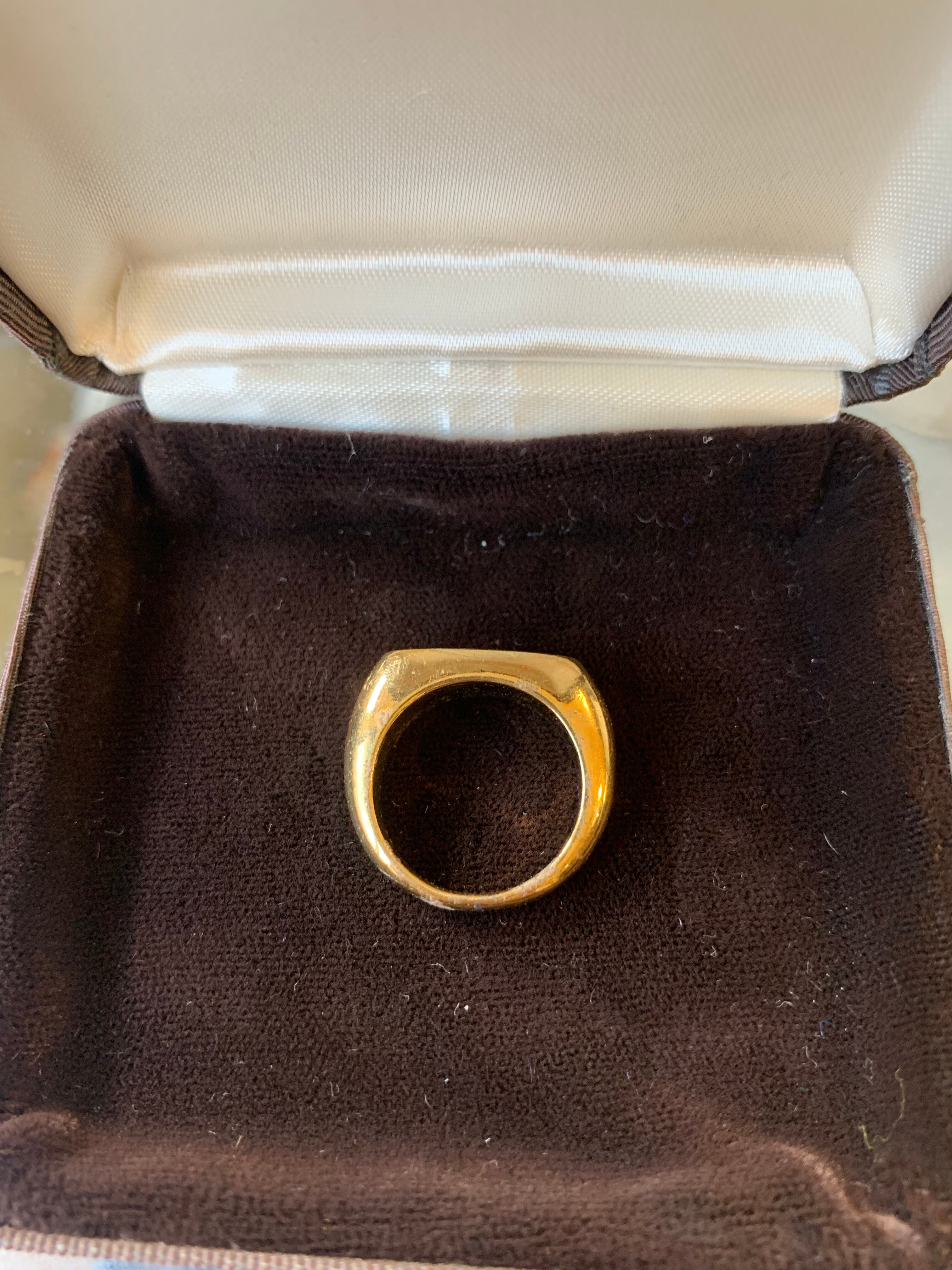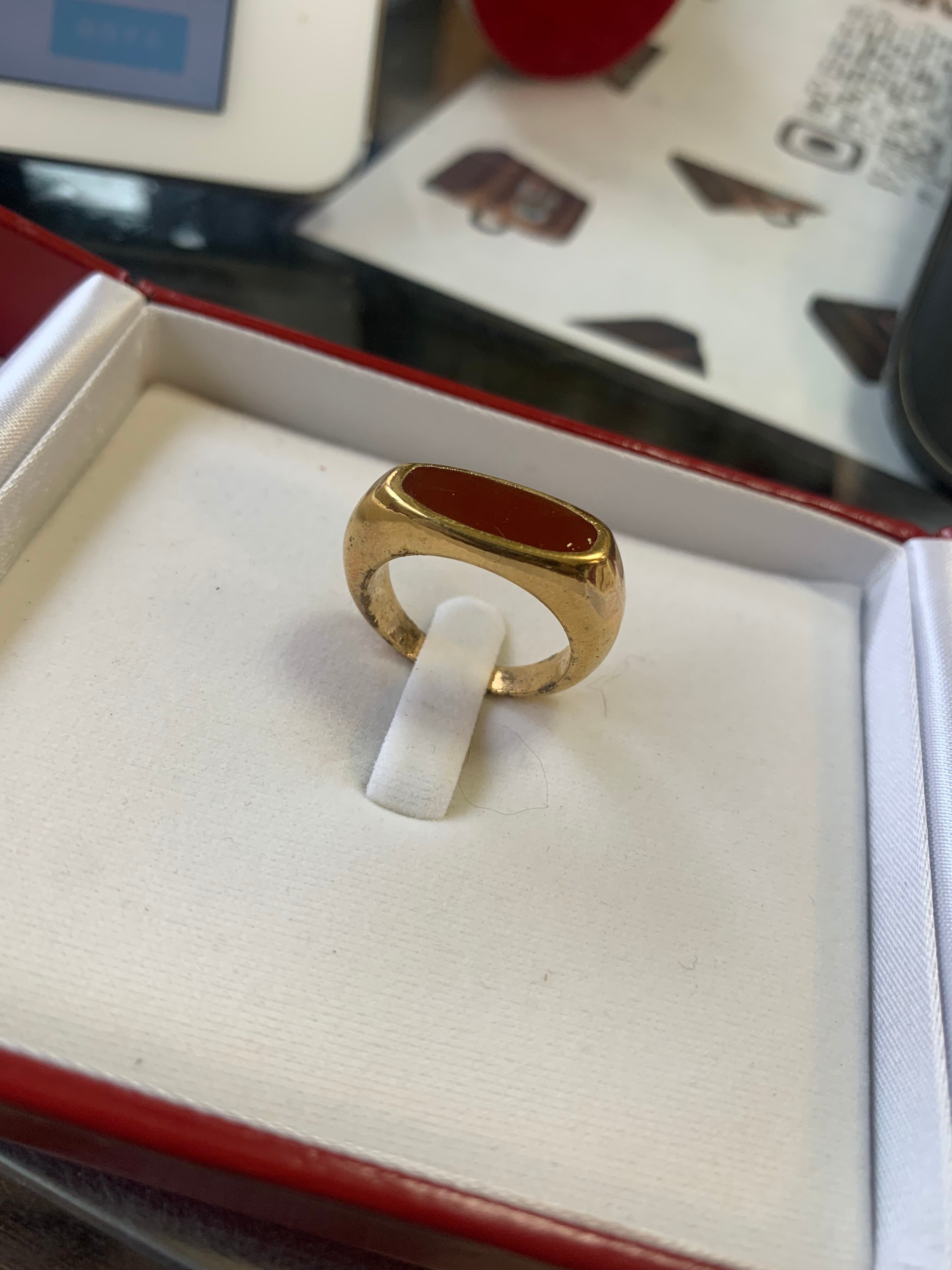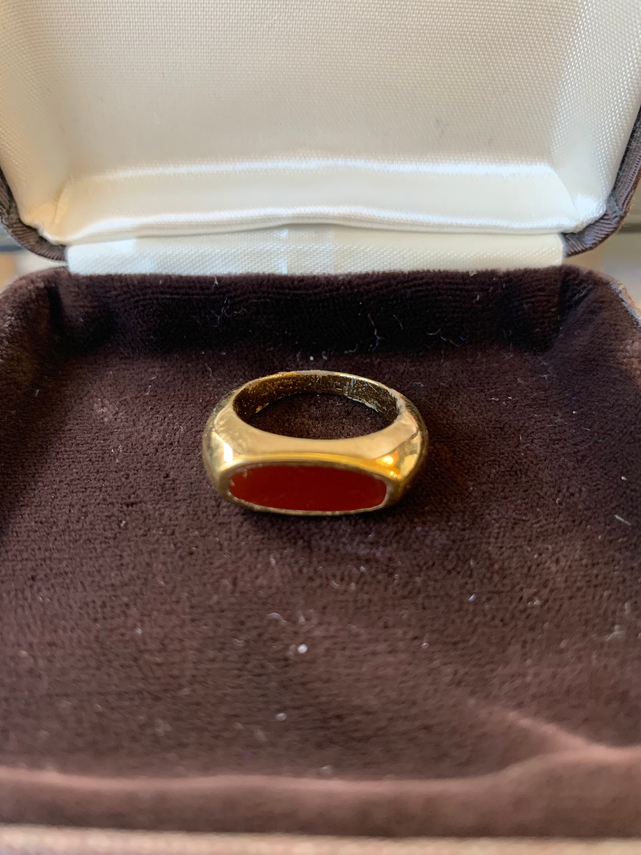 ゴールドメッキのポディに赤茶色の石が映えるリング。